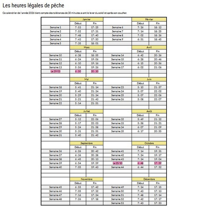Heures légales de la pêche 2026