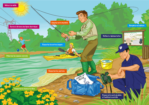 Ainsi la Fédération Nationale de la Pêche en France a décidé d’établir une charte, afin de rappeler les règles d’usage et de bon sens, articulée autour de 5 thèmes majeurs : sécurité et réglementation, respect du milieu naturel, des espèces, des lieux et des usagers.